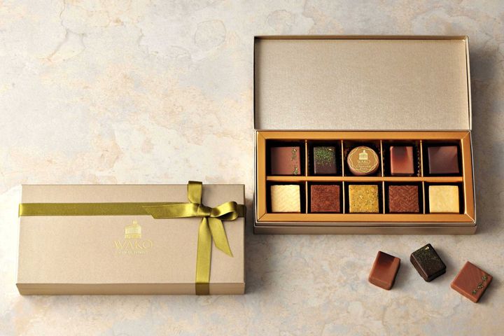 パリ流儀の伝統製法を守りながら、銀座の⾃家アトリエで⼀粒ずつ丁寧に⼿づくりしている和光のショコラ。今シーズン限定の新コレクションは「Aroma Japonais(アロマ ジャポネ)」がテーマです。スペシャリテに詰まっているショコラ・フレは、⽇本で育まれた5種類の茶葉(柿の葉茶、抹茶、和紅茶、⿊⾖茶、ほうじ茶)と出合うことで⽣まれた新たな味わい。⼿仕事だからこそ実現できるフレッシュな⾵味と繊細な⼝溶け、そして重なり合う和の⾹りを楽しめます。味わい深い5種のスペシャル ショコラ・フレと自慢のクッキーを組合せた「ショコラ・フレ×クッキー」が詰まっているのも嬉しいポイント。アロマをイメージしたシャンパンゴールドのボックスに、お茶をイメージしたグリーンのリボンをあしらった和光らしい上品なデザインです。