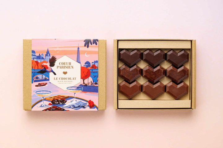 厳選したカカオを使い、パリと東京の工房で職人が手作りする、フレンチの巨匠アラン・デュカス氏のショコラ専門店「ル・ショコラ・アラン・デュカス」。絶大な人気を誇るペピクールは幾何学デザインが印象的なハート型ショコラで、今年はストロベリーのガナッシュが詰まったショコラ オ・レ、ピスタチオのプラリネが詰まったショコラ ノワール、そしてユズのガナッシュとココナッツのプラリネが2層になったマーブル仕立てのショコラ、3種のフレーバーで登場しました。セーヌ川のほとりでカクテルとショコラを楽しむパリらしい情景を描いた、フランスの人気イラストレータ ポール・シラン氏によるお洒落なデザインのパッケージも魅力的です。