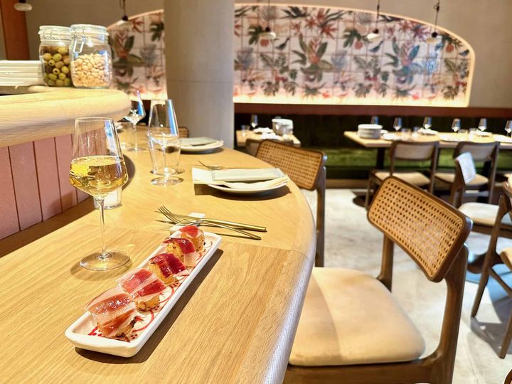 ランチは、香ばしく焼き上げたバケットに、ジューシーなビーフステーキと芳醇なハモン・イベリコをサンドした「Pepito(ペピート)」や、ハモンセラーノ&トリュフクリームのホットサンド「Bekini(ビキニ)」が人気のメニュー。ディナーは、ハモンとワインをゆったりと味わうアラカルトメニューが中心で、⾃家製マリネオリーブの盛り合わせや、イワシの酢漬けとアンチョビを合わせた「マトリモニオ」、ピクルスとオリーブを串にしたバスク地⽅の定番「ヒルダ」、スペイン産チーズの盛り合わせなど、素材の個性を際立たせた多彩な⼩⽫料理や本格的なパエリアが揃います。