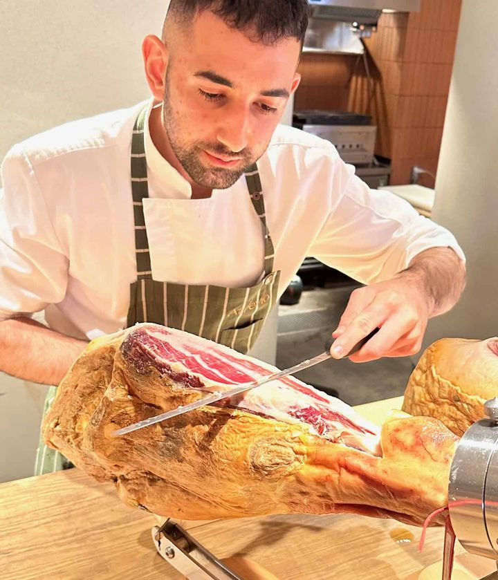 アトレヴィオの希少なイベリコ黒豚をハモン専⾨家・コルタドールがスライスする、切り⽴てハモンが絶品!