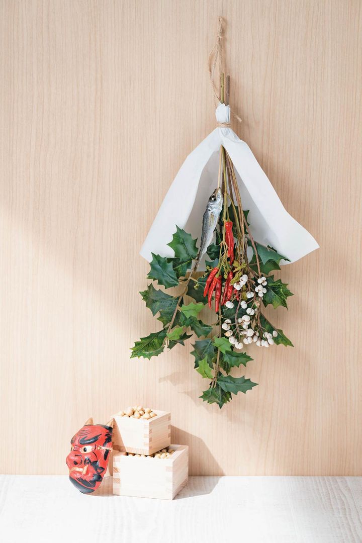 節分には、鬼が嫌う「柊鰯」を飾る伝統がありますが、これを現代風にスワッグ(壁飾り)にアレンジ。干物は本来イワシですが、小アジや煮干しなど手に入りやすいもので。