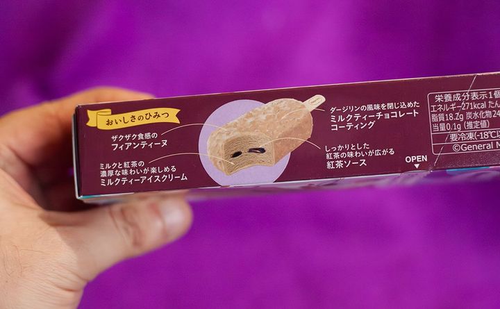 同商品のメインは、ミルクと紅茶の濃厚な味わいを楽しめるミルクティーアイスクリーム。その中には香り豊かな紅茶ソースが隠れていて、外側はダージリンの風味とザクザク食感が特長のフィアンティーヌを閉じ込めたミルクティーチョコレートコーティングで包んだアイスです。