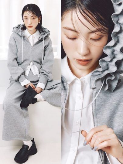 フードに施した旬のデザイン。短め丈でコンパクトに着られ、逆開ファスナーでスリット風アレンジも楽しめます。同素材の美シルエットボンディングロングパンツを合わせて着こなしたい。