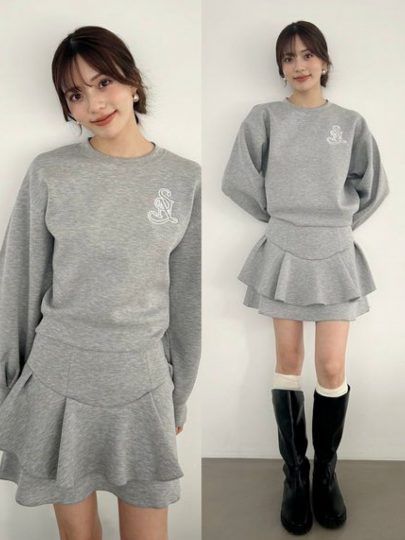 シンプルながらボリューム袖のデザイン&大きなエンブレムが、カジュアルすぎない印象に。同素材のボンディングスカショーパンは、ロー位置で切り替えたフリルがトレンド感を盛り上げ、これまた可愛い♡ ぜひセットアップで!