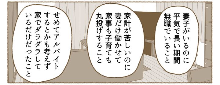 夫は妻子がいる身にもかかわらず、平気で長い期間無職でいるし、アルバイトすらせず、家でダラダラして家事も子育てもしていなかったのです。