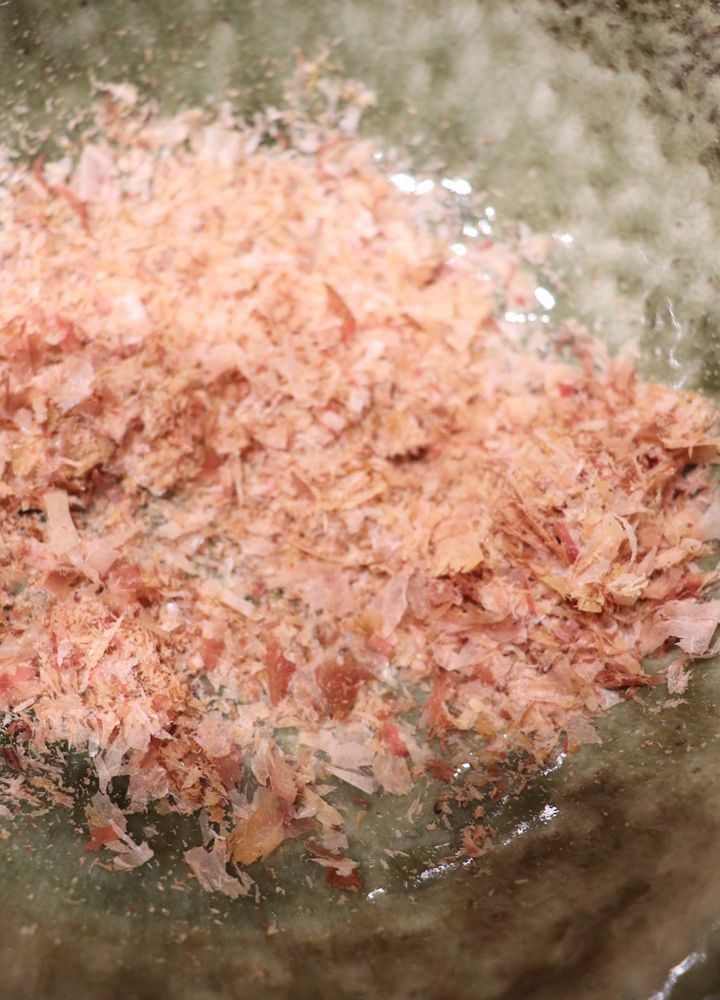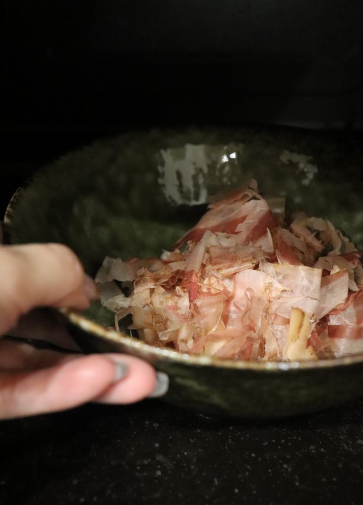 ③鰹節を耐熱皿に入れラップをふんわりかけ電子レンジで600w50秒で温める。