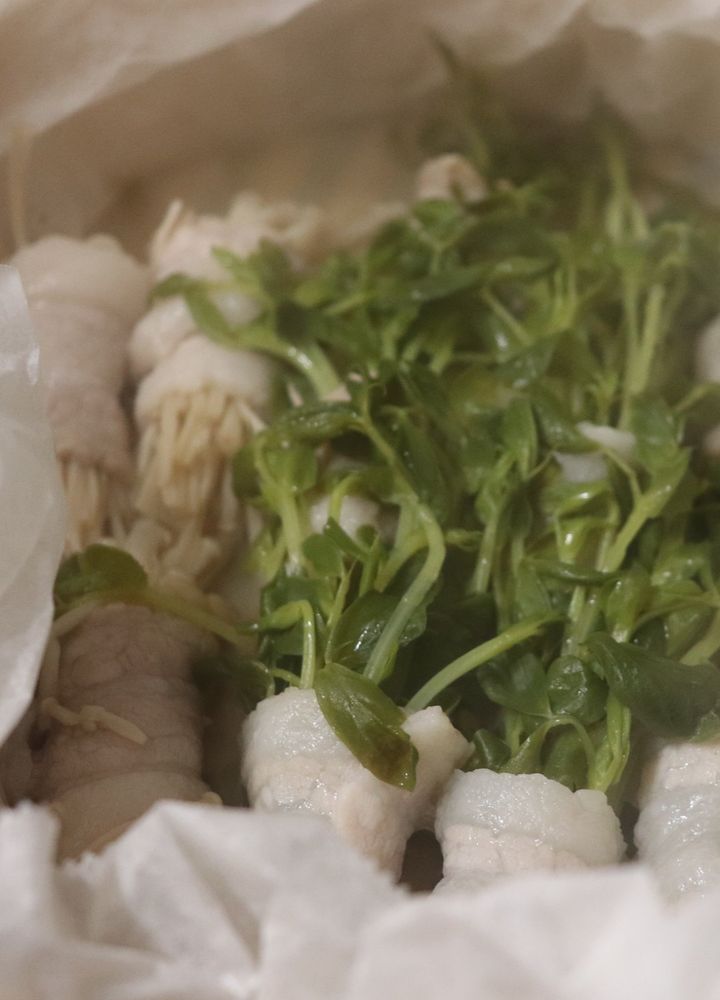 ①豚バラ肉で好きな野菜やきのこを巻く。