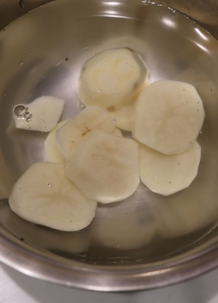 ⑤じゃがいもを下に敷き詰めそのうえに具材を乗せていく。