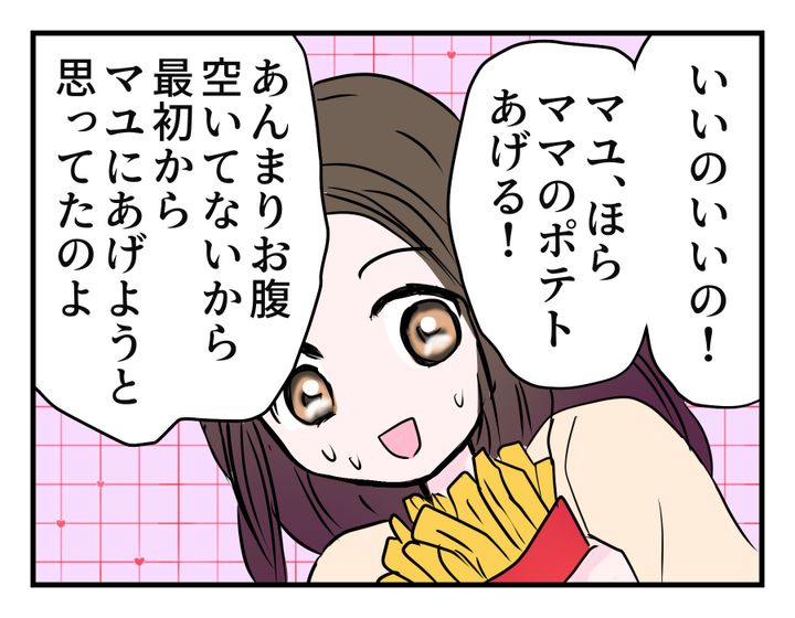 人との衝突が苦手なミチルさんは、娘のフライドポテトを食べ尽くされても、ルナちゃんをたしなめたりシオンさんを責めたりするなんて到底できません。逆に自分が気を遣い、どうすればこの場を収められるかと必死に立ち回ります。結局、ミチルさんのフライドポテトを渡すことでマユちゃんは落ち着いてくれましたが……「よその家のダイエットに巻き込まれるなんて」というなんとも言えない気持ちが残るのでした。