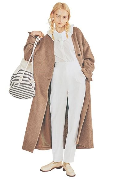 シャープな白に沿わせるように直線的なレイヤード。スマートな白のIラインを寒々しく見せない、コートのやや肉厚な素材感を利用。