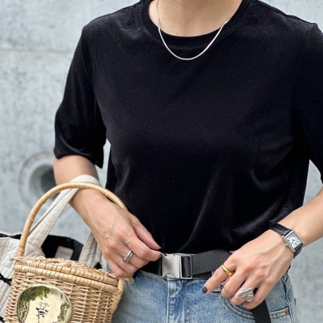 毛足が長い起毛素材であるベロアは上品で女性らしい雰囲気。最近ではTシャツやプルオーバーの生地としても人気です。