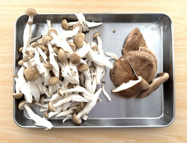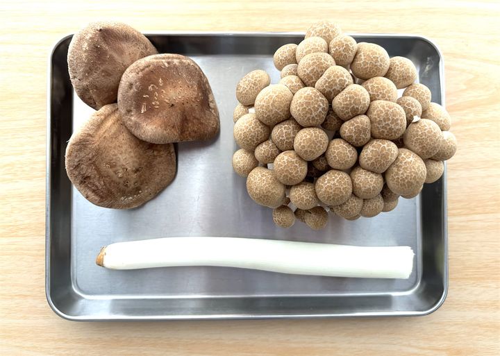 1. しめじは石づきをとってバラバラにし、しいたけは軸の固い部分をとって半分に切る。