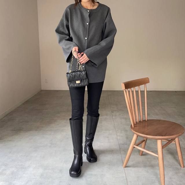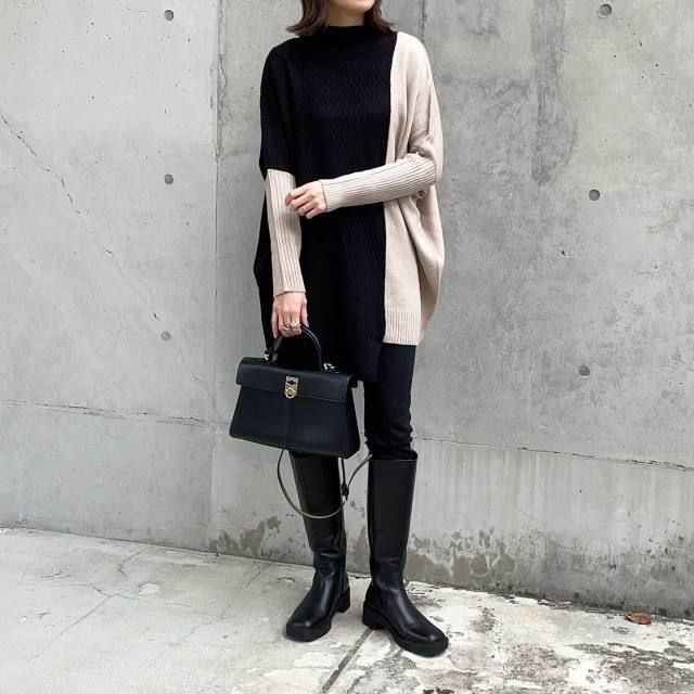 黒スキニーパンツは「黒ロングブーツ」と相性バツグン。ブーツインするとパンツとブーツが繋がり美脚見えします。さらに長め丈&オーバーサイズのニットを合わせれば、黒スキニーの肉感が目立たずスマートに着こなせます。