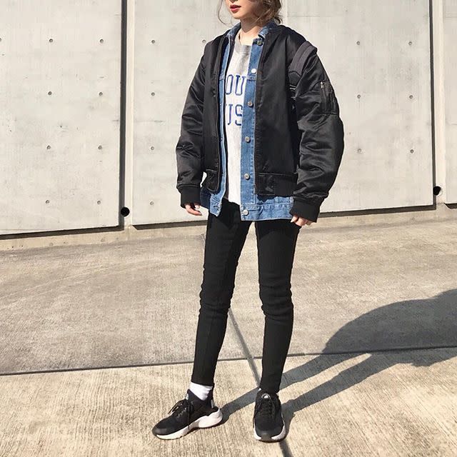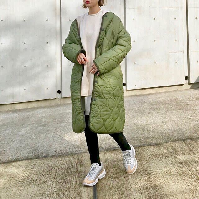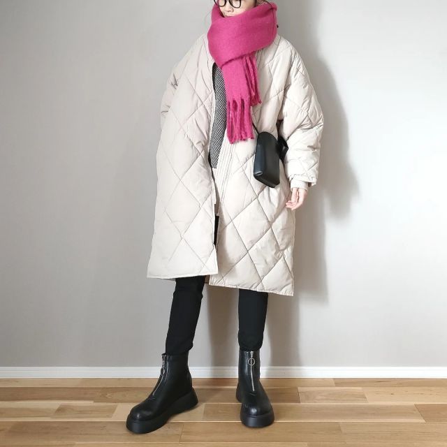 黒スキニーパンツの本領が発揮されるのが、キルティングやダウンなどボリュームアウターを着るとき。収縮色&細身シルエットのパンツがもこもことしたアウターを引き締めて着膨れ感を解消してくれます。