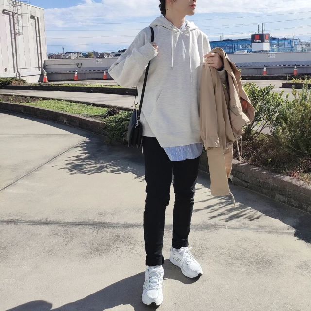 黒スキニーパンツに「ゆったりめのパーカー・スウェット」を合わせるとスポーティな雰囲気に。爽やかなムードに決まることで、黒スキニーコーデがおばさん見えしませんよ。