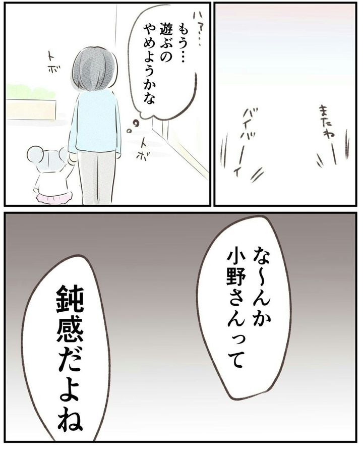 本作では、子ども同士のケンカがママ友トラブルに発展してしまった様子が描かれています。同じマンションだから、同じ年ごろの子どもがいるから…と、ムリに関係を続けていた小野さん。ところが、結局は関係は終わりに近づいています。