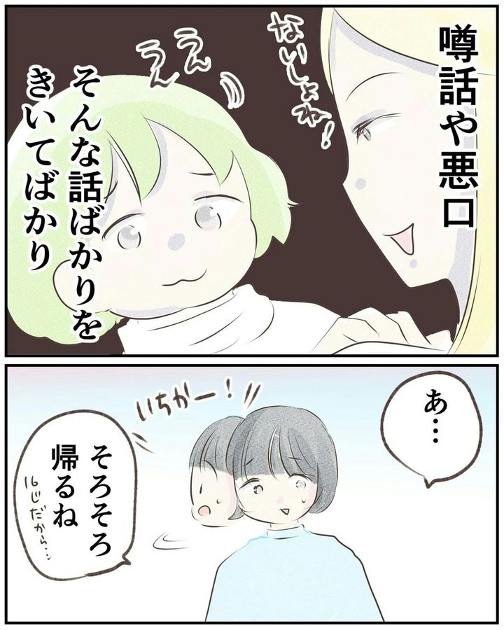 悪口ばかり聞かされるのは、しんどいですね。さらに、よそよそしい態度のママ友2人…。そろそろ離れたほうが良さそうです。