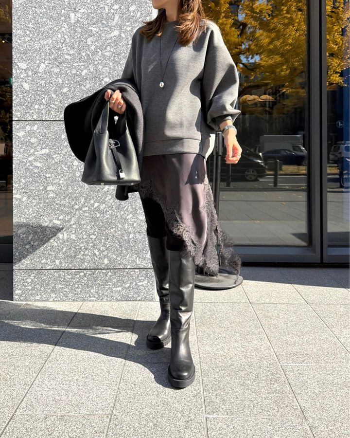 ボトムスにはタイトなレギンスパンツを合わせ、ロングブーツで足元にボリュームを出すことで、全体のバランスがぐっと引き締まります。落ち着いたチャコールグレーのワントーンに、ブラックの小物を効かせた配色は、大人の日常にふさわしい洗練された印象を与えてくれます。