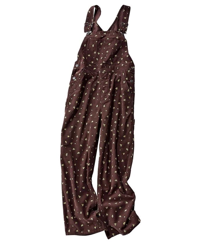 こげ茶サロペ×コーデュロイ×小花柄の遊び心たっぷりな1枚をあえてのキレイめアイテムで合わせたい。