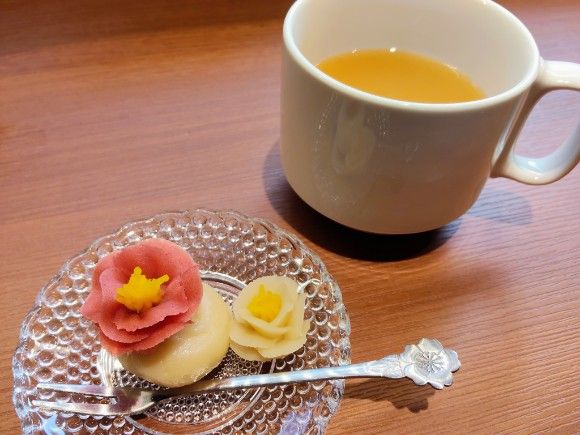 お団子の上があんこのお花絞りです。季節感を感じられるようなお花絞りに食べるのがもったいない気もしました。しっかり撮影してからパクリ。こひの喫茶のりんごジュースとともに頂きました。とっても優雅な気分になれますよ‼