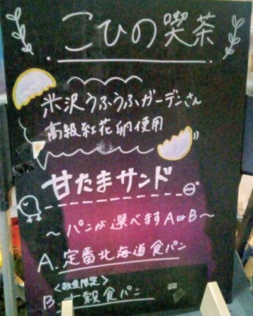 この看板は昨年末の屋外イベントのものです。真ん中に【甘たまサンド】と書かれていますよね。これが、こひの喫茶の定番メニュー。この後、おいしい写真を見ていただきます。