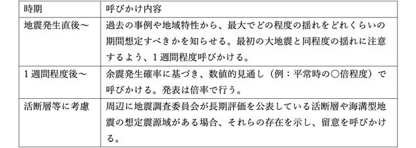 このように、地震直後は経験則に基づいた呼びかけを行い、1週間後は統計的な見通しを加え、さらに地域の特性や活断層の有無も踏まえて注意喚起をします。