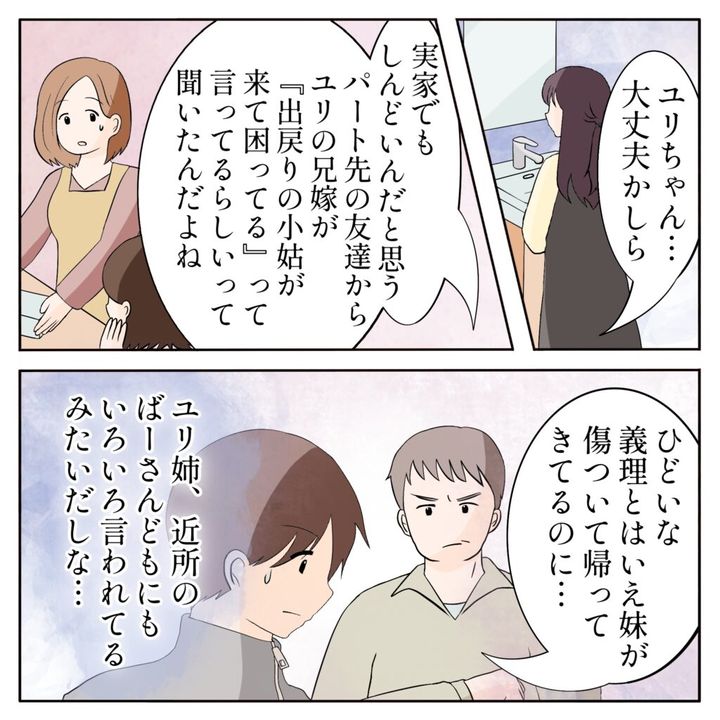 ユリ姉が顔を洗いに席を外している間、「ユリちゃん・・大丈夫かしら」と心配する母さんに、「実家でもしんどいんだと思う。パート先の友達から、ユリの兄嫁が『出戻りの小姑が来て困ってる』って言ってるらしいって聞いたんだよね」姉ちゃんがそう言い、「ひどいな。義理とはいえ妹が傷ついて帰ってきてるのに・・」父さんも話を聞いて険しい表情に。「ユリ姉、近所のばーさんどもにもいろいろ言われてるみたいだしな・・」心の中で呟きながら、ユリ姉が心配でなりませんでした。