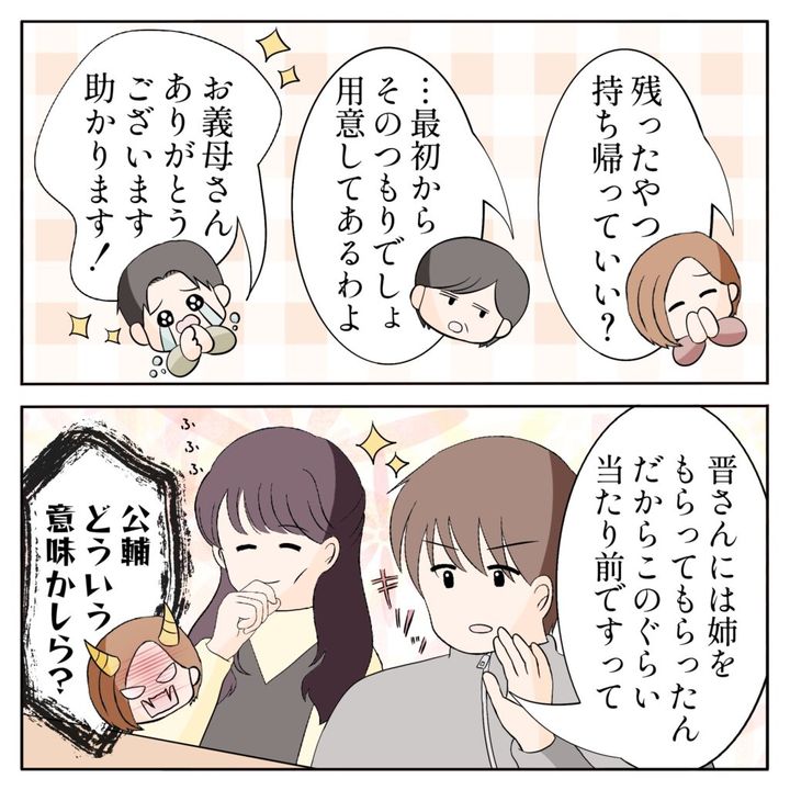 すると、「残ったやつ持ち帰っていい?」と姉ちゃんが言い出し、「・・最初からそのつもりでしょ。用意してあるわよ」と呆れて答える母さん。「お義母さんありがとうございます。助かります!」と姉ちゃんの夫晋さんまで大喜び!「晋さんには姉をもらってもらったんだから、このぐらい当たり前ですって」と俺が真顔でそう言うと、「公輔、どういう意味かしら?」と姉ちゃんが怒り出しました。