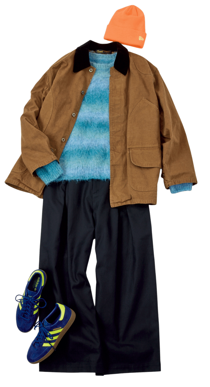 ジャケット¥64,900/グランク(NISHINOYA)、ワイドパンツ¥17,600/リメール(リメール ストア)、ニット帽¥3,520/ニューエラ、スニーカー¥15,950/アディダス オリジナルス(アディダス コールセンター)