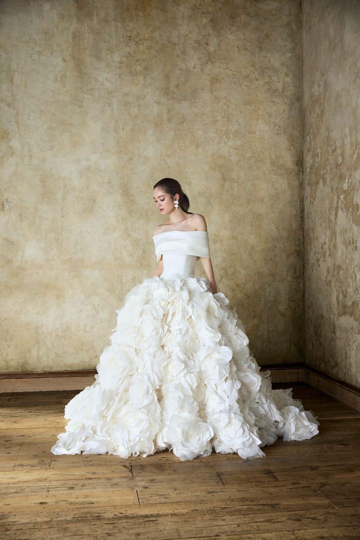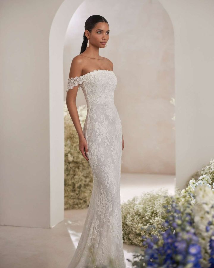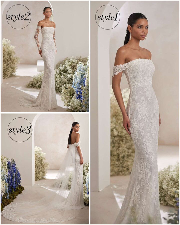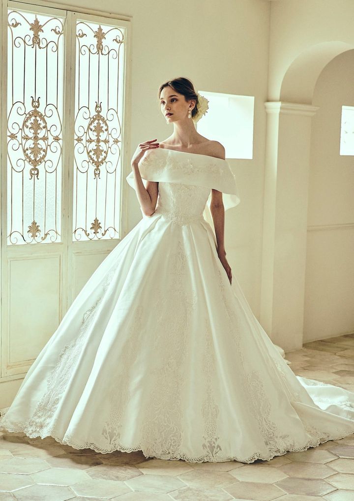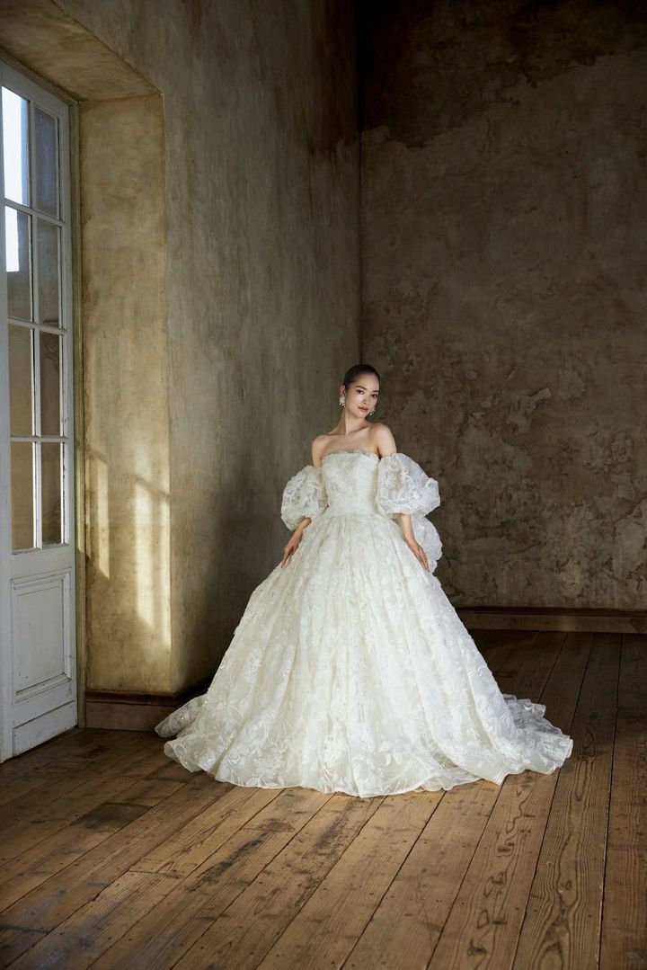 スペインを代表する人気ブランド、ロサ・クララにもチェンジャブルドレスが。フランス製の上質なレースを贅沢に使用したマーメイドドレスは、オフショルダー部分を外してベアトップスタイルとして着こなすこともできます。
