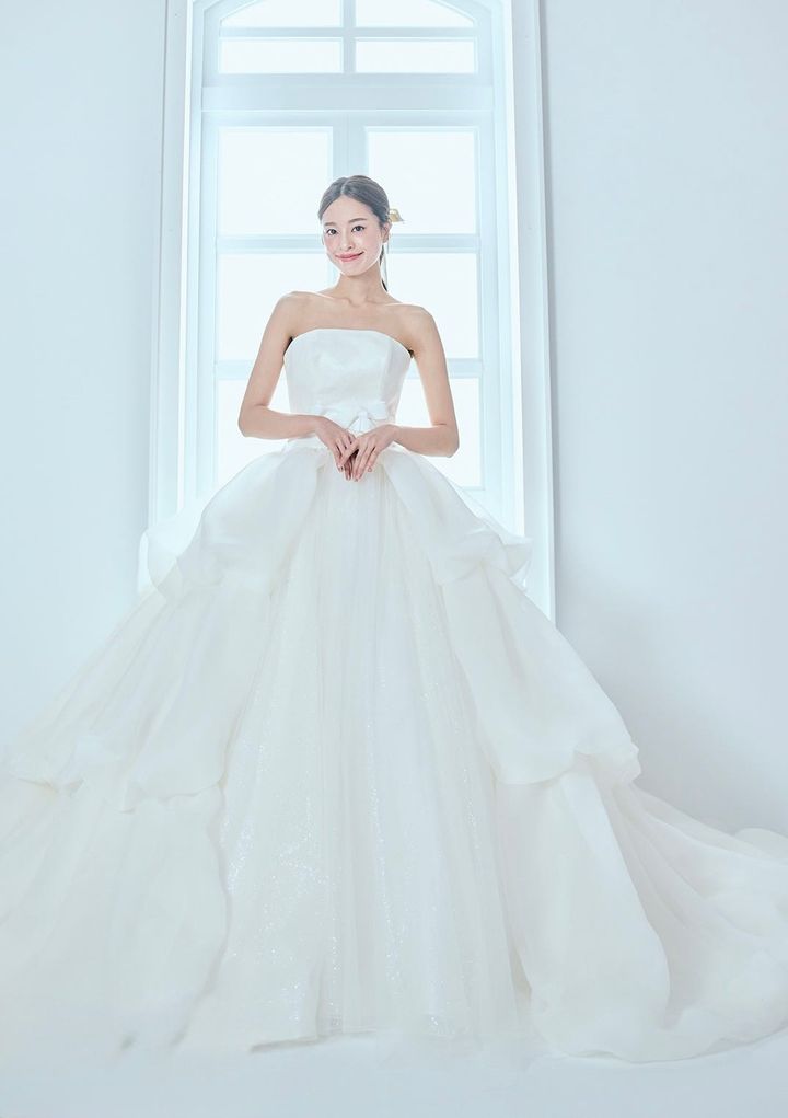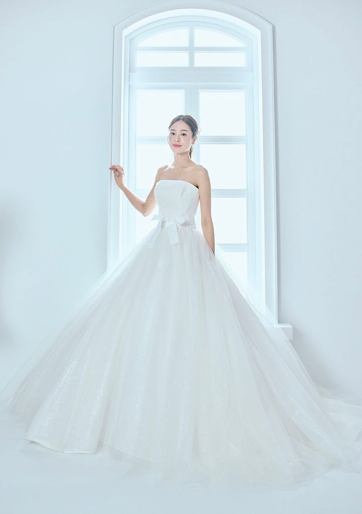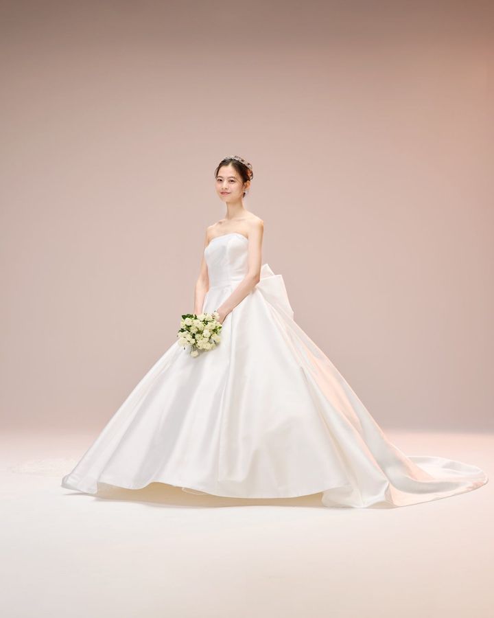 シンプルなビスチェにプリンセスラインを描くスカートが上品かつ華やか。ウエストに大きなリボンをあしらっているので、花嫁らしい存在感を演出してくれます。
