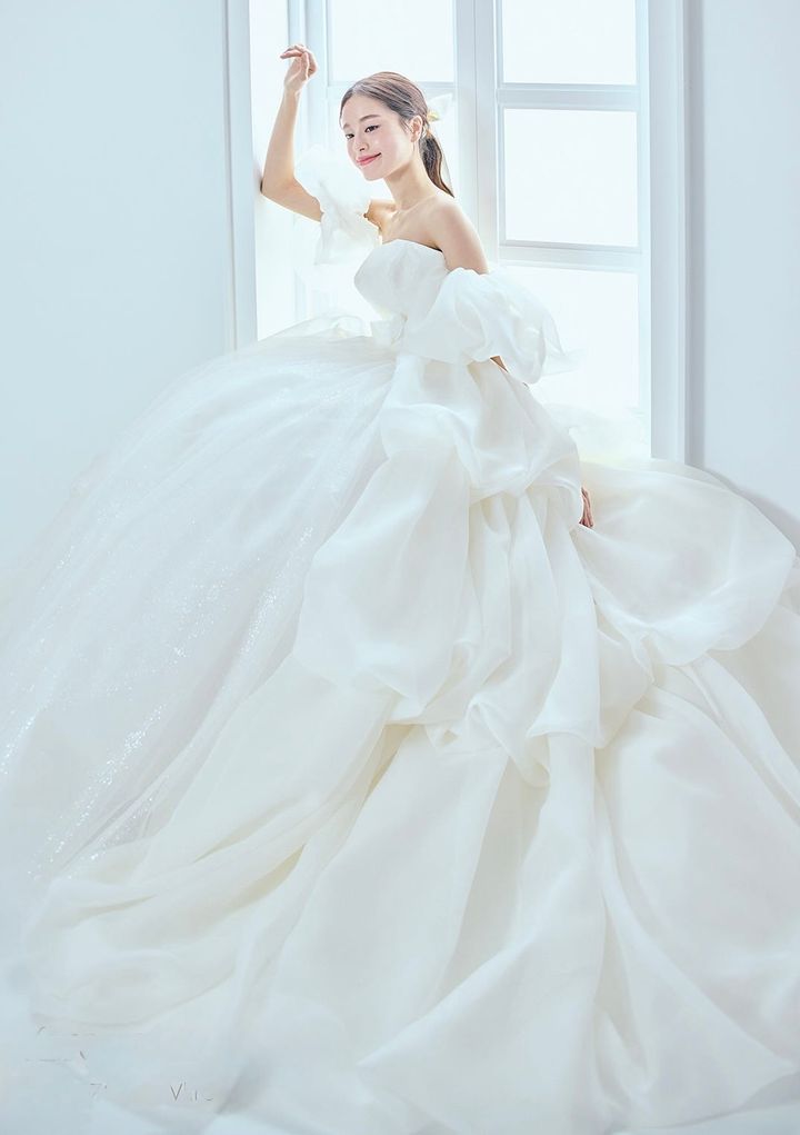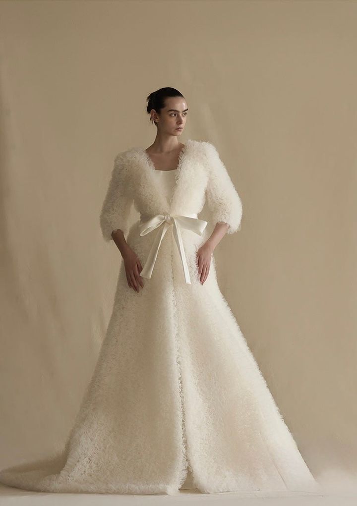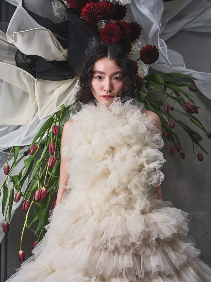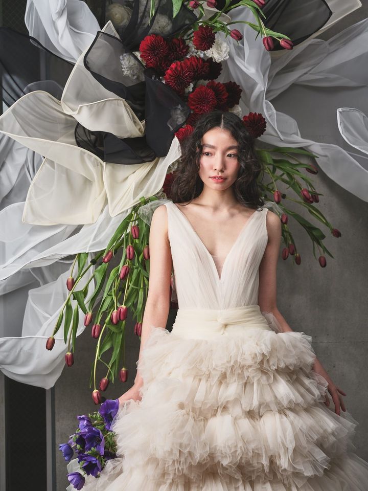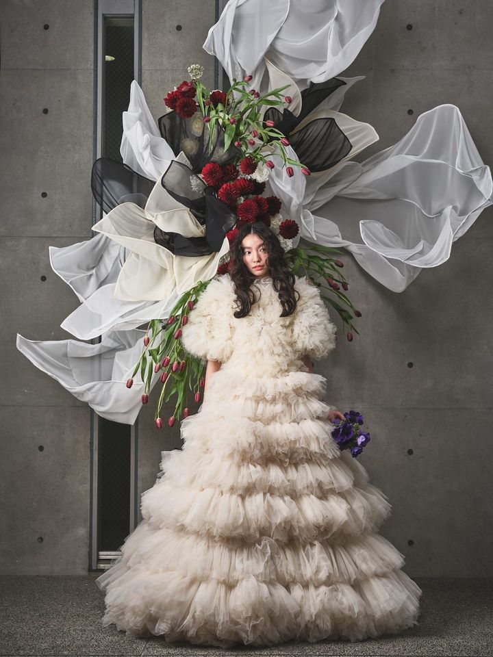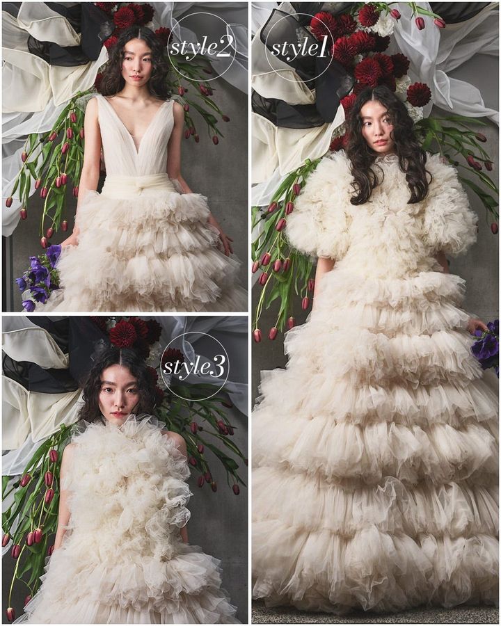 柔らかなスーパーソフトチュールを贅沢に使用したフリルドレスは高感度な花嫁に人気。袖ありのボレロを着ると秋冬のウエディングにもぴったりのモコモコスタイルが完成!