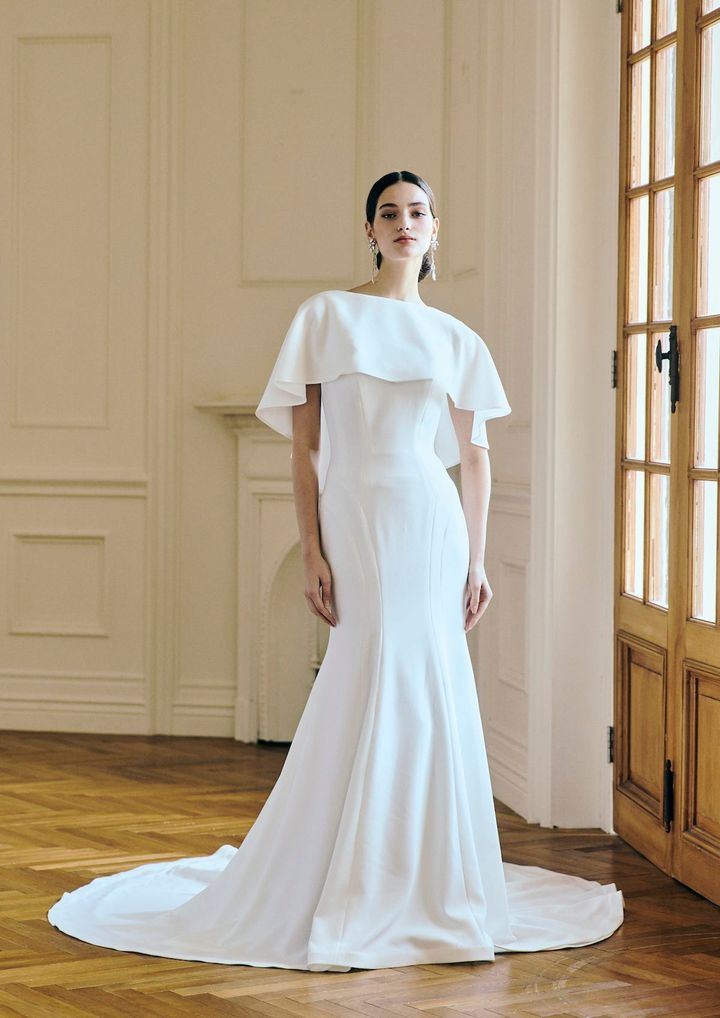 素材の美しさを感じさせるモノマテリアルドレス。肩口を覆う同素材のケープをプラスすると、しとやかな雰囲気を演出します。
