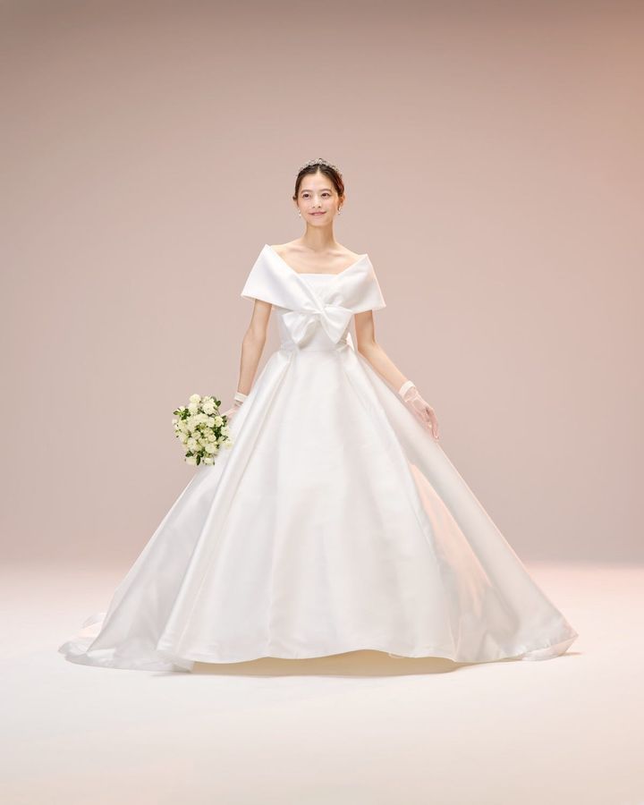 上品なサテンの光沢を楽しめるモノマテリアルのビスチェドレスに、リボンケープをプラスしました。オフショルダースタイルはデコルテを美しく見せてくれます。