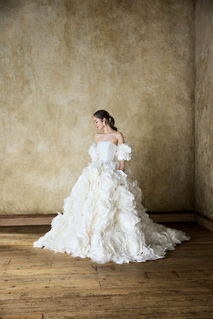 上質なミカドシルクを惜しげもなく使用したビッグスカートのドレス。大胆な3Dフラワーモチーフを胸もとにあしらい、華やかな上半身を演出します。