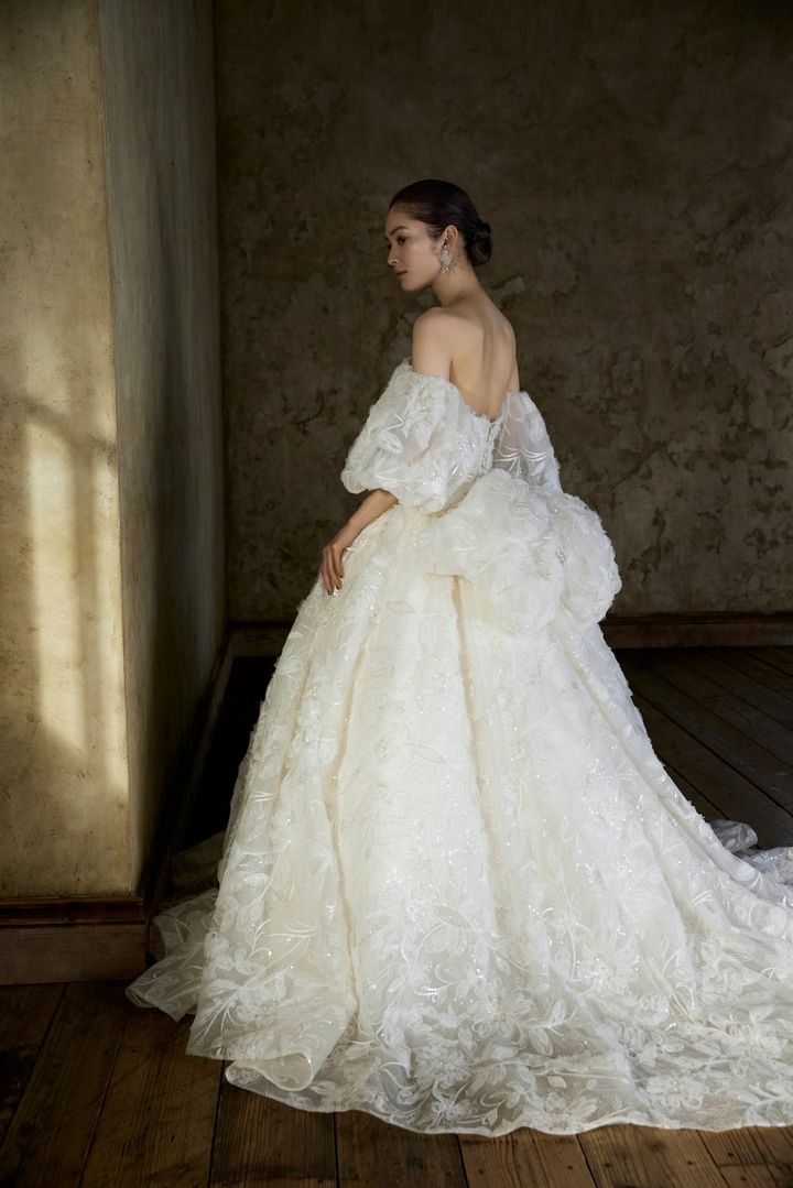空気感のある大きなパフスリーブに、バックリボンの組み合わせはとてもキュート。全方位的に可憐なブライズスタイルの完成です。