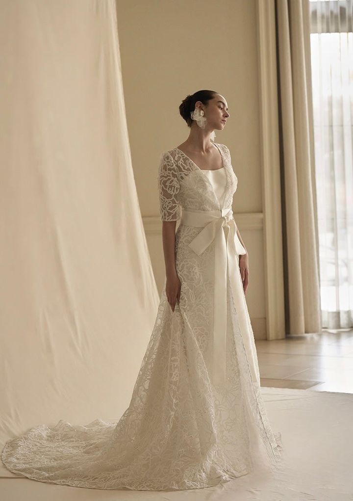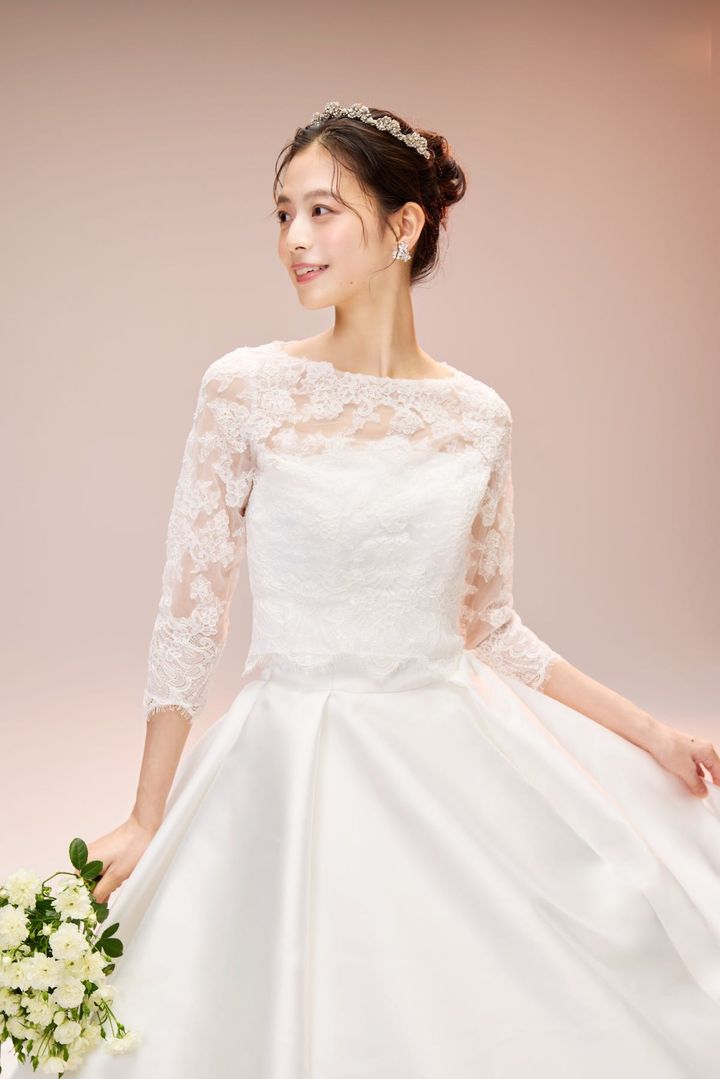 デタッチャブルのロングスリーブを付けると、ぐっとエレガントな装いに。控えめな露出でセレモニースタイルとしてもおすすめです。