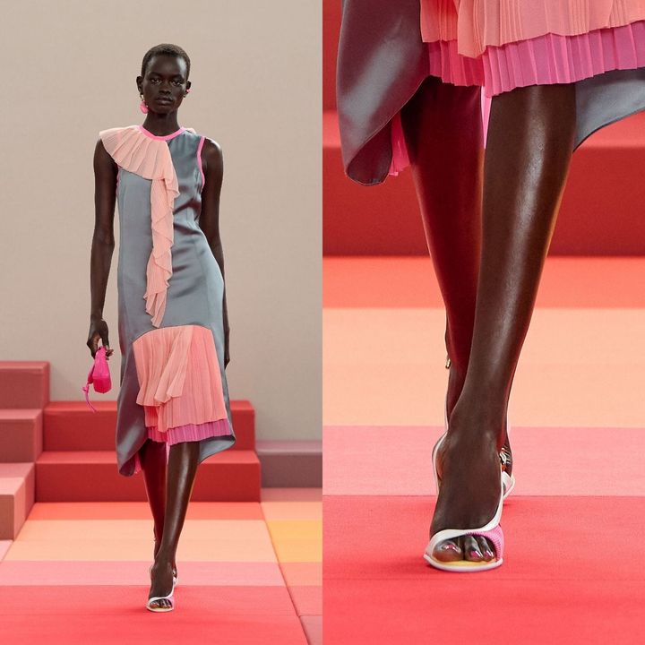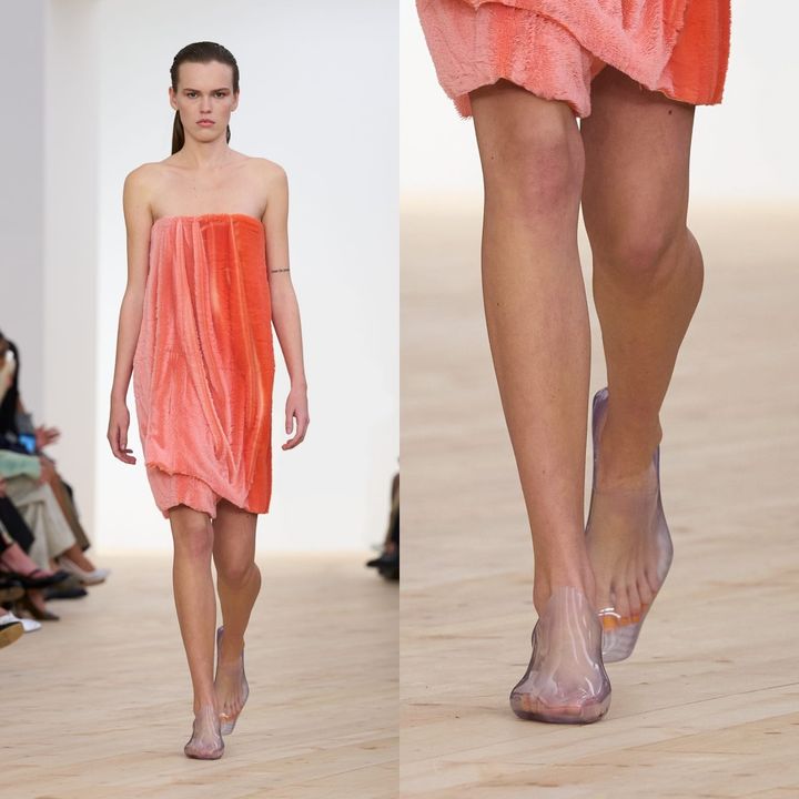 オレンジのドレスにスケルトンシューズを合わせたLOEWE(ロエベ)は、ビーチを思わせるムードをドレッシーに昇華しています。