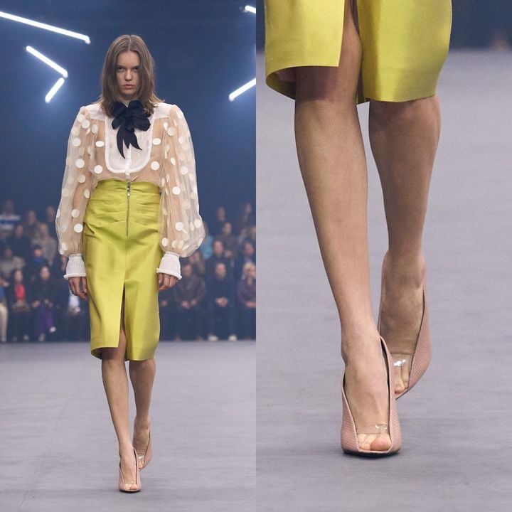 ヌーディーな足元のもうひとつのアプローチが、見せるための透明感ではなく、「どう見えるか」を再定義した“スケルトン素材の透け感”でスキンのような質感をつくるシューズ。靴をアクセントとしてシャープに効かせるのではなく、肌とシューズの境界線を曖昧にすることで、華やかなレディなスタイルの足元に詩的でセンシュアルな印象をもたらします。