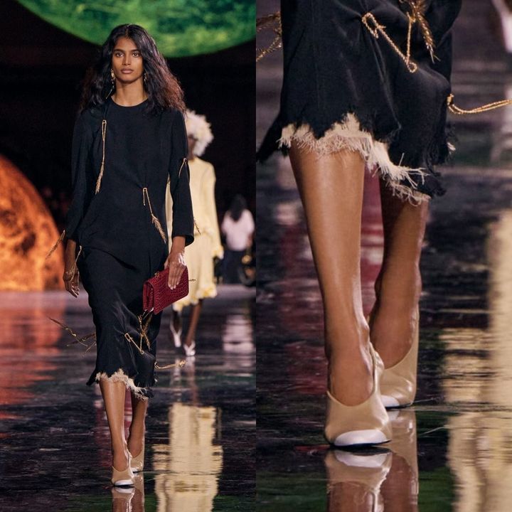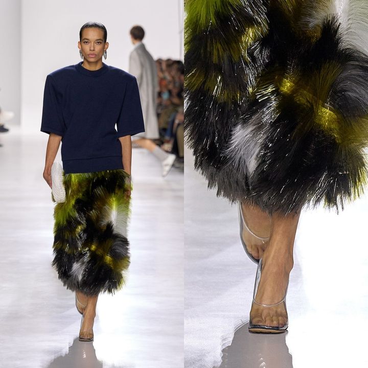 BOTTEGA VENETA(ボッテガ・ヴェネタ)は、フレーム感のあるトップスとリサイクル素材を使用したフリンジを全体にあしらったスカートがつくるボリュームシルエットを、スケルトンヒールで軽快に整えています。