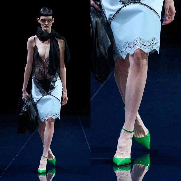 繊細なレースとカッティングが美しいドレスに、艶やかな素材のグリーンのシューズを合わせたTOM FORD(トム フォード)。カラーを差し込むことで、素材感と色味がアクセントとして効いています。