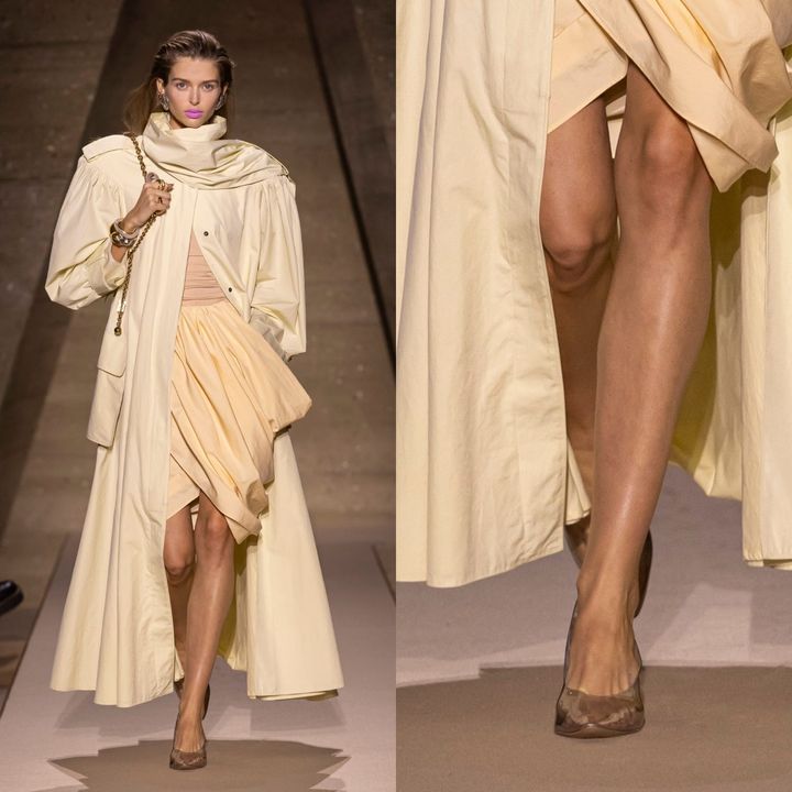 VALENTINO(ヴァレンティノ)は、大胆なカッティングのヌーディーカラーのシューズをスタイリング。シアー素材のトップスと呼応するように、素肌のニュアンスを足元まで繋げています。