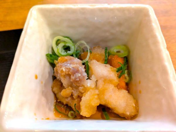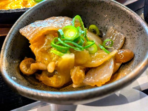 小鉢がおいしいですね。コンニャクとしめじと白ネギが煮物のように炒めてあります。柔らかくてやさしい食感のおばんざいです。これも酒のアテにぴったりですね。熱燗で飲みたいですね~。堺筋本町の地下レストラン街にあるリーズナブルな価格でお酒と創作料理が楽しめる創作居酒屋さんでした。