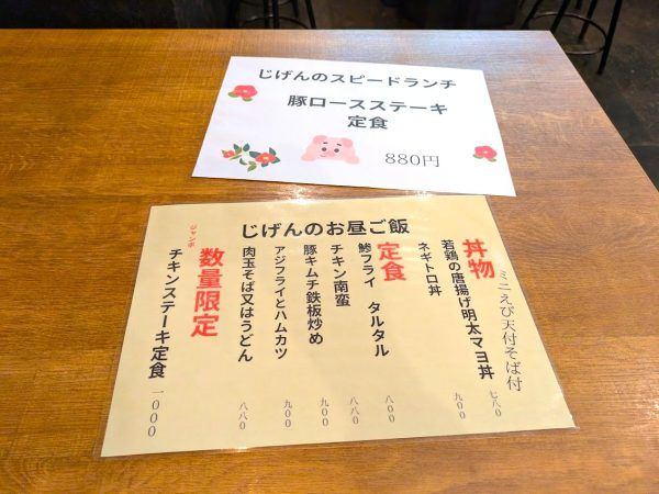 本日のスピードランチは、豚ロースステーキ定食です。おいしそうです。定番メニューの中に数量限定のじゃんぼチキンステーキ定食もあります。