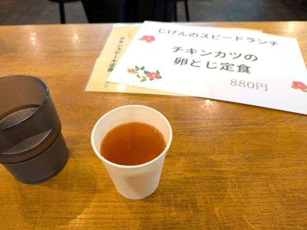 豚ロースステーキ定食 880円 スピードランチは、メインの豚ロースステーキに、サラダ・小鉢・漬物・お吸物・ご飯付きです。セルフサービスで、アップルティーをいただきました。