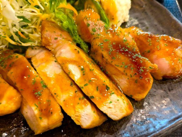 肉厚な豚ロースステーキですね~。大好きです。照り焼きソースのかかった柔らかくてジューシーな豚ロースステーキです。