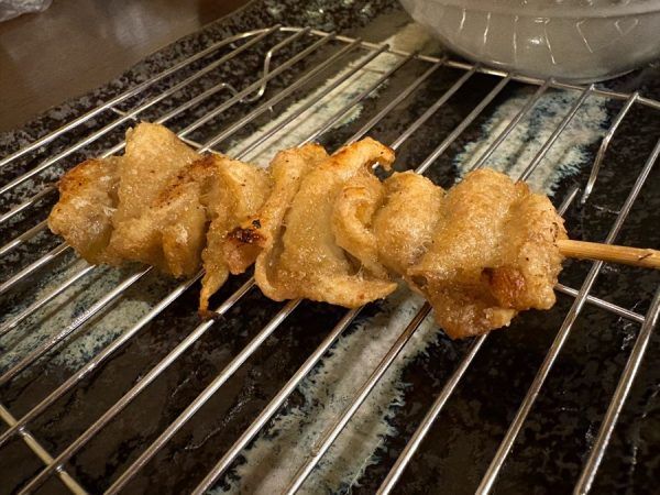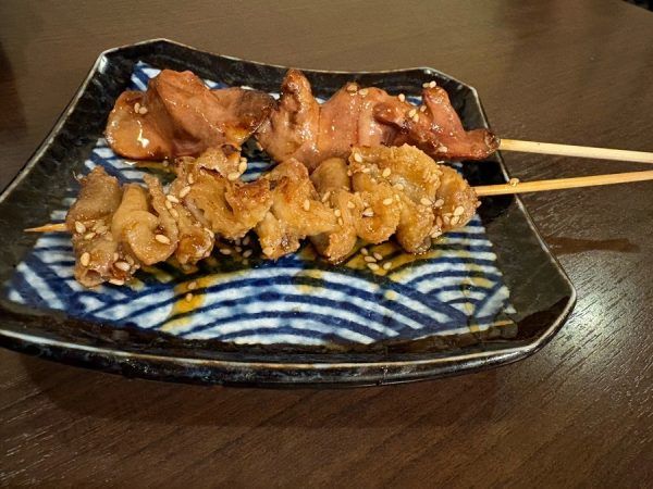 まずは焼き鳥の中でも必ず頼む、定番のとり皮(170円)! 塩派⁉︎タレ派⁉︎どちらも比べられないくらい好きなので、両方注文しました。