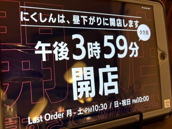 場所は国道202号線の昭和通り沿いにあります。いつも前を通ると、もくもくと美味しそうな香りに誘われます。 1996年にオープンされたようです。 タッチパネルで注文します。いきなり面白い! 開店時間はなぜか15時59分からだそうです(笑)