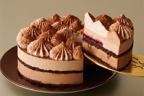 「ショコラフィネ」(3,024円)は、チョコレートムースとヘーゼルナッツムースをあわせたチョコレートケーキ。フランボワーズジャムとチョコパフの食感も楽しめます。