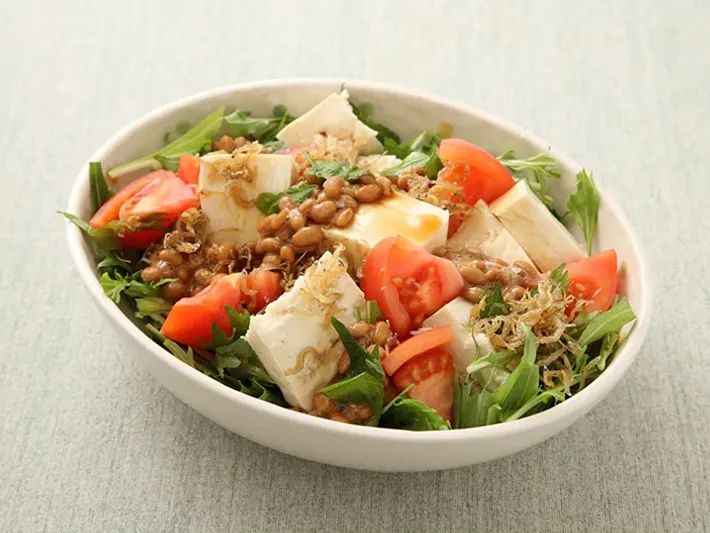 こちらはかけるだけでドレッシングのようにお使い頂けるレシピです。豆腐や納豆を使用し、『味ぽん』でさっぱりと召し上がって頂けます。